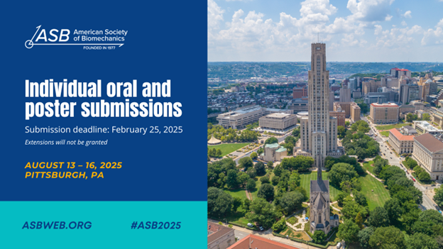 We are so excited about the program that is coming together for ASB 2025 in Pittsburgh at the David L. Lawrence Convention Center (August 13-16). We have two fantastic keynote speakers confirmed for the meeting: Dr. Rory Cooper from the University of Pittsburgh and Dr. Suzanne Maher from the Hospital for Special Surgery. The 2025 meeting will begin with a wide range of workshops and tutorials that will be announced soon. The deadline for submission of symposia was on January 16 and we had a total of 13 submissions. The dedicated members of the Program Committee (Kim Bigelow, Peter C. Fino, Jason Franz, Alexa Johnson, Maria Ramos Gonzalez, and Meghan Vidt) are currently finalizing the list of accepted symposia, and we expect to have an exceptional lineup spanning multiple domains of biomechanics.